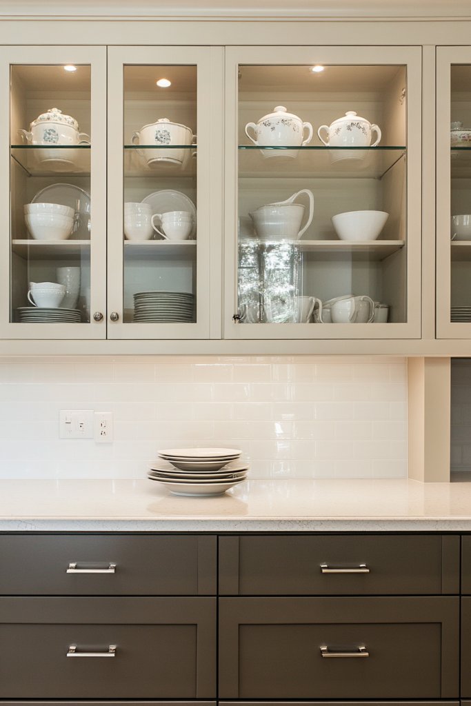 Decorate with colorful dishware, vintage teacups, or unique ceramics to add personality. Use LED strip lighting inside the glass cabinets to illuminate your display. Incorporate decorative trims or molding to frame the glass doors beautifully. Personal touches like a small chalkboard label or a decorative plate can add charm.