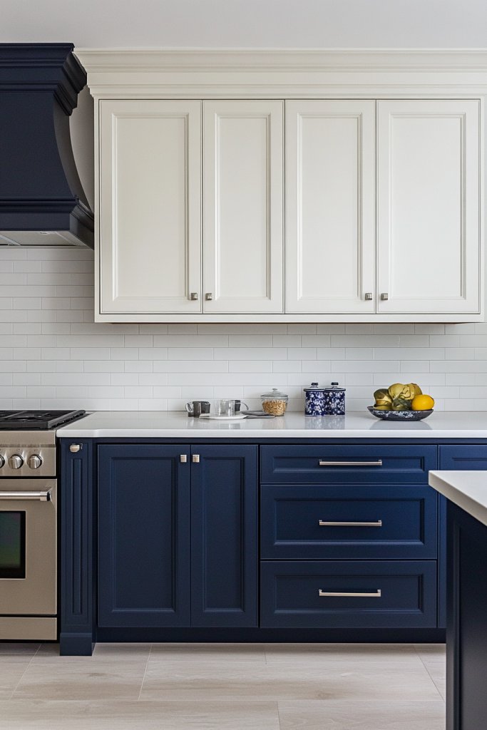 You can swap navy for deep black or forest green based on your personality. For a more playful vibe, try pastel-colored lower cabinets paired with crisp whites. If space is limited, keep the bold color on just one feature wall or an accent island. Seasonal updates could include changing hardware or adding decorative textiles that complement the main color theme.