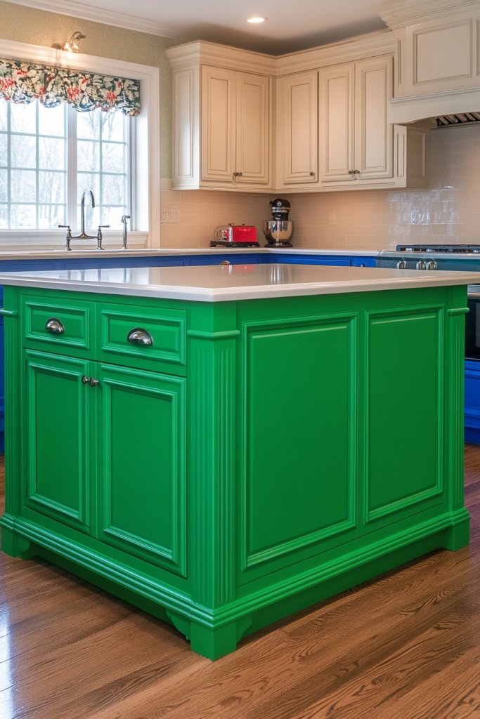 Select high-quality, durable paint or laminate in your chosen bold shade for the island and lower cabinets. Keep the upper cabinets neutral or white to balance the look. Use contrasting hardware and consider adding a decorative trim or molding to emphasize the island. Ensure the work surfaces and backsplash coordinate with the overall color scheme. Regularly clean to maintain the vibrancy of the colors.