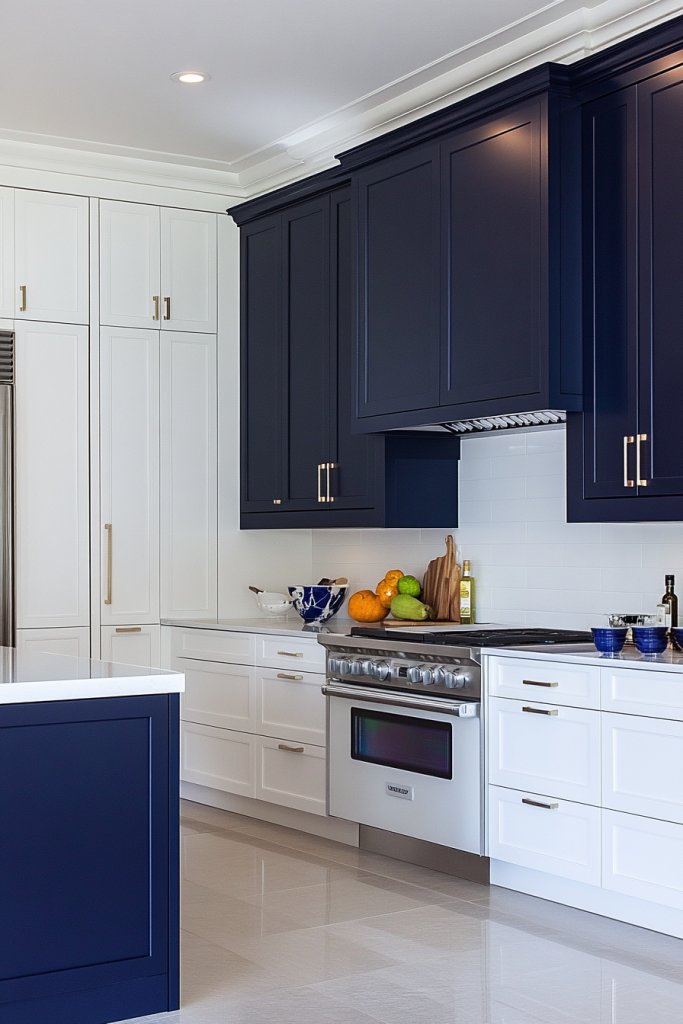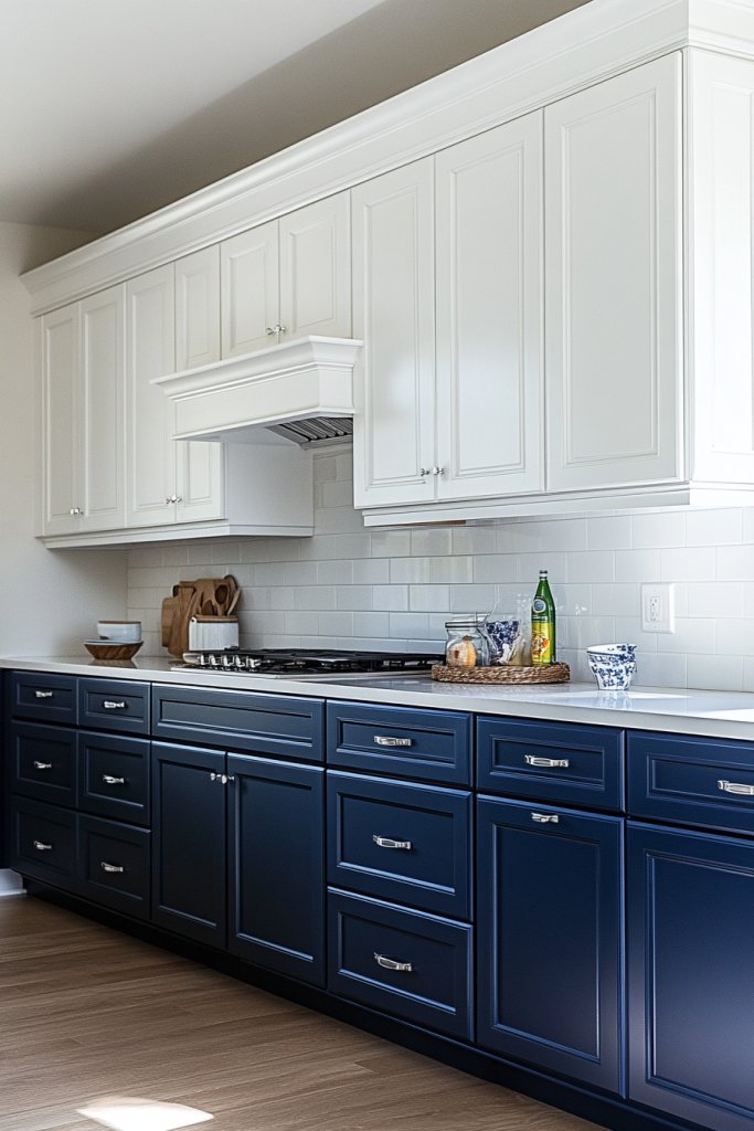 Start with high-quality white and navy paint or laminate finishes for durability. Choose cabinets with simple, clean lines to emphasize the classic look. Install stainless steel or brushed nickel hardware for a subtle shine. For the backsplash, consider white subway tiles with navy grout for added contrast. Use light-colored countertops, like quartz or marble, to keep the space feeling airy. Finish with nautical-inspired accessories on open shelves or hooks.