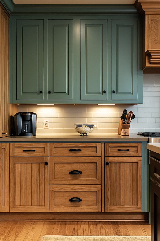 Experiment with different wood tones—light oak, dark walnut, or warm cherry—to suit your style. For a contemporary look, keep the painted cabinets in matte finish with smooth surfaces, contrasting with textured wood. You can also add decorative wood panels or accents on the walls. Seasonal updates might include swapping out textiles or accessories that complement the material contrast.