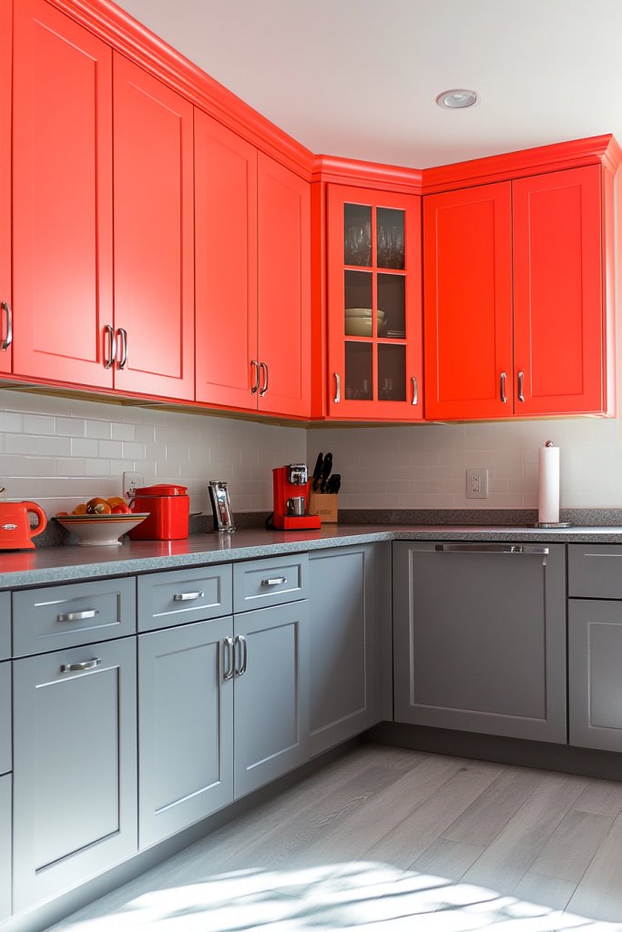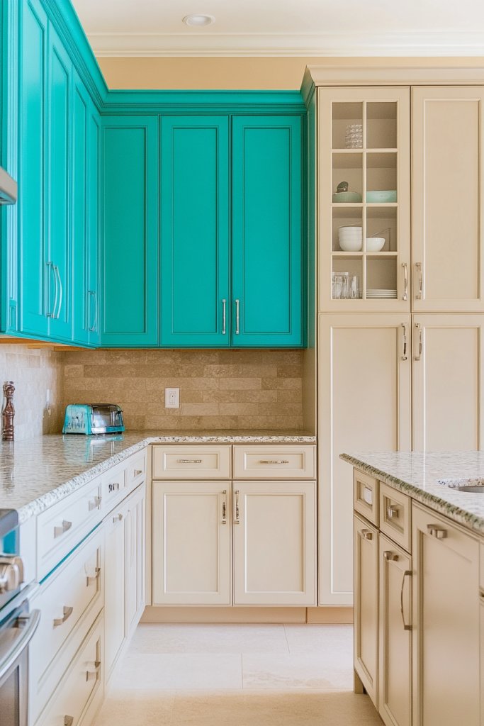 Imagine coral or turquoise cabinets on top, complemented by subdued beige or gray bases. The vivid colors lift the room, while the neutral lower cabinets keep it grounded. Add a simple countertop—like light quartz or butcher block—that balances the boldness above. Incorporate minimal hardware and a clean backsplash to keep the focus on the color pop.