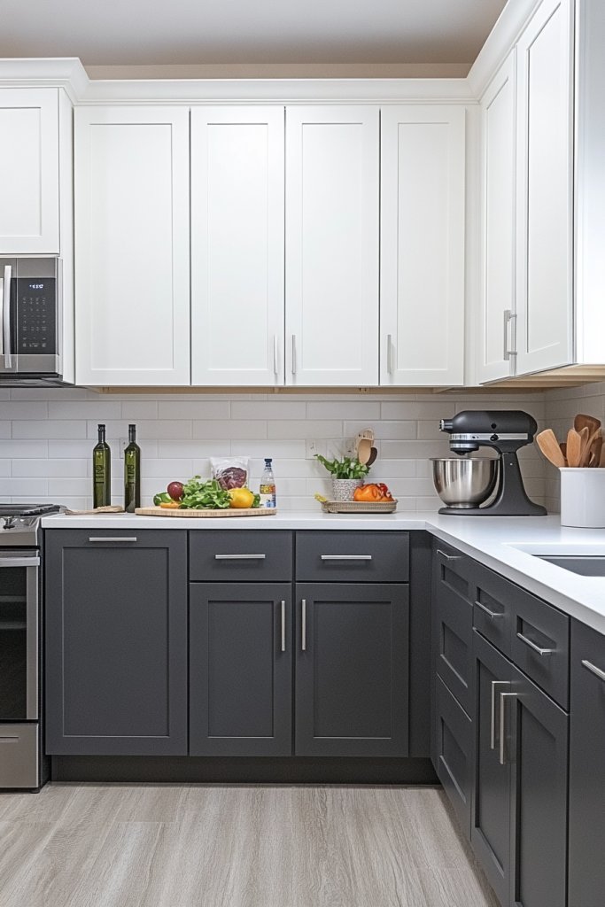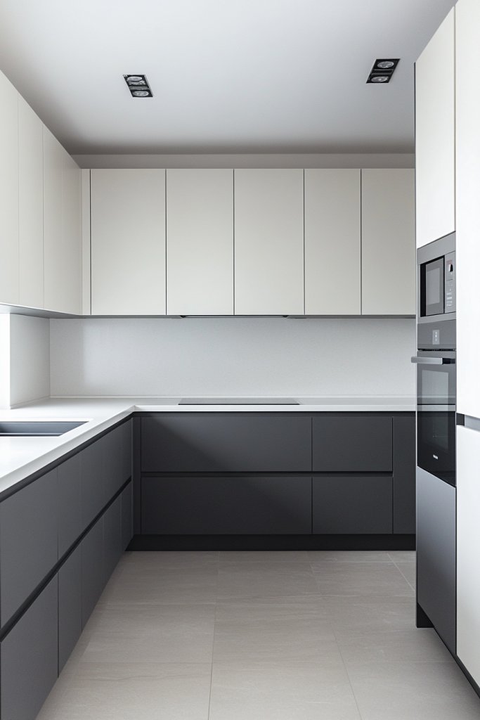 Select high-quality matte finishes for durability and a sophisticated look. Use contrasting hardware—think matte black with gold accents—to enhance visual interest. Incorporate simple, clean-lined cabinetry with flat fronts for a sleek appearance. For the countertops, go with quartz or marble in light tones to balance the dark upper cabinets. Finish off with subtle backsplash tiles or painted walls in complementary shades.