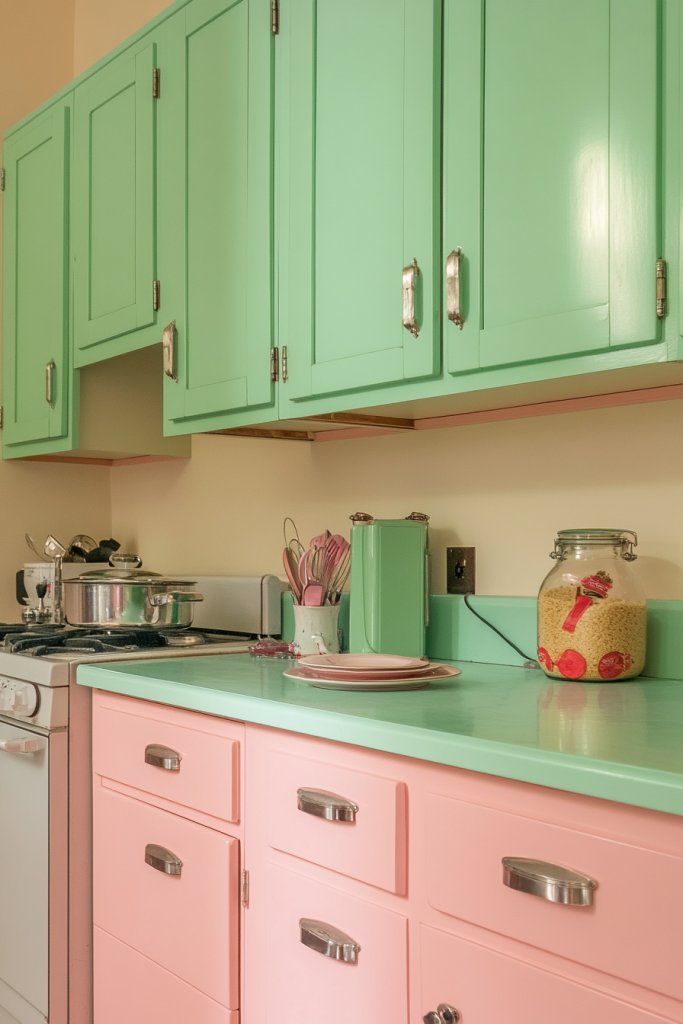 Craving a kitchen that feels charming and nostalgic? Vintage-inspired color combinations, like mint and blush or muted teal and soft pink, bring a retro flair that’s full of personality. If you love the idea of a cozy, nostalgic space, this style makes it easy to create that vibe.