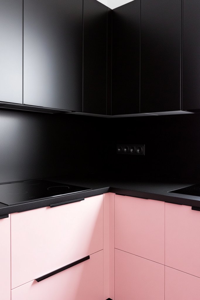 Visualize matte black upper cabinets paired with blush pink or mint green lower units, creating a striking yet harmonious contrast. The matte finish diffuses light, reducing glare and adding a velvety texture. Accentuate the look with gold or brass hardware for a touch of luxe. Light-colored countertops and subtle geometric tiles complete the aesthetic, making the space feel fresh and modern.