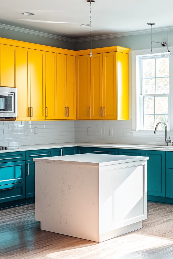 Picture vibrant teal or mustard-colored upper cabinets contrasted with neutral lower units in shades like white, gray, or beige. The island, in a matching or contrasting hue, becomes a focal point that anchors the space. Incorporate sleek, modern hardware and a statement countertop—like quartz or concrete—for added impact. The open layout, paired with colorful accents, makes the space feel dynamic and inviting.