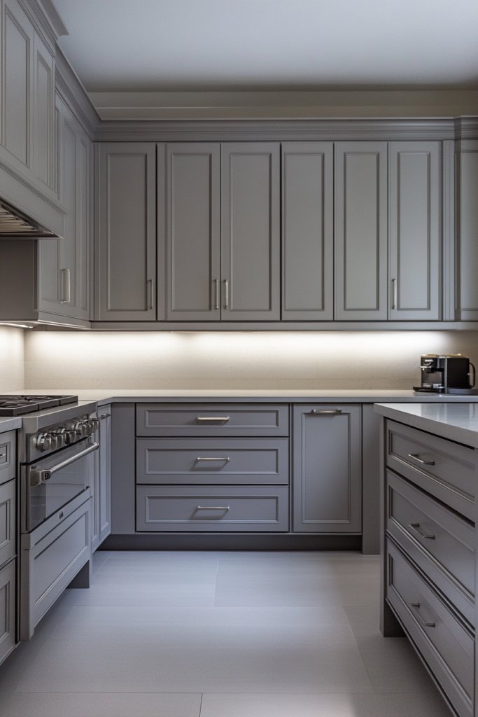 Choose high-quality paint or laminate finishes in varying shades of gray. Opt for sleek, minimalist cabinet designs with push-to-open mechanisms for a streamlined look. Use durable countertops like quartz or concrete in matching tones. Install simple, matte hardware—think black or brushed nickel—to keep the look understated. Consider textured backsplash tiles or subtle wall paints to add visual interest while maintaining harmony.