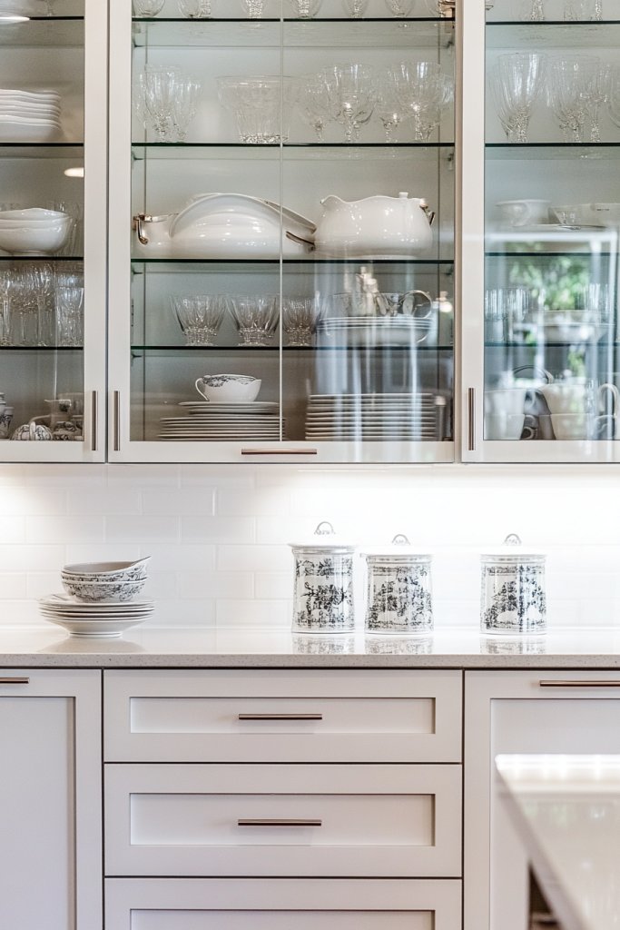 Select cabinets with clear or frosted glass doors, ensuring durability and ease of cleaning. Use LED strip lights or puck lights inside for illumination, especially for display purposes. Keep the solid lower cabinets in a neutral or matching color, with sleek handles or push-to-open mechanisms. Opt for durable countertops like quartz or granite to balance the transparency of the upper cabinetry. Finish with coordinated hardware and simple backsplashes.