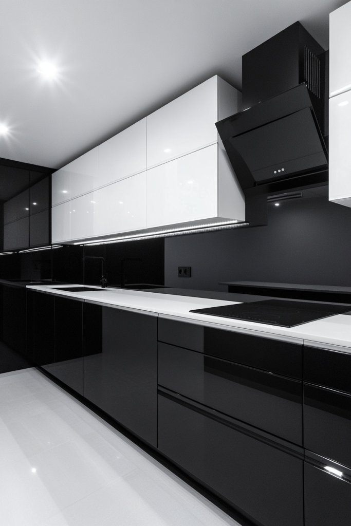 Choose durable, high-quality finishes in black and white, prioritizing materials resistant to fingerprints and smudges. Consider handleless cabinets or sleek bar pulls for a minimalist appearance. Use contrasting counter materials—black granite or white quartz—for durability and style. Incorporate under-cabinet lighting to highlight the sleek surfaces and add depth. Finish with subtle decorative details like a metallic faucet or modern light fixtures.