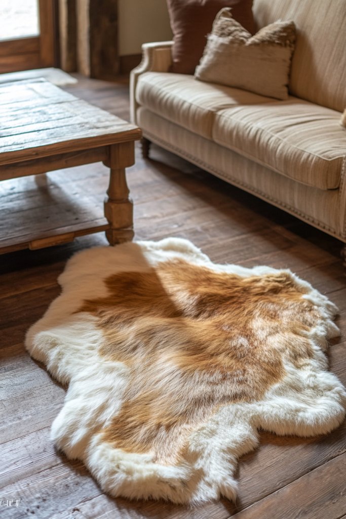 Want to add a tactile layer of comfort and authenticity to your living room? Animal hide or faux fur accents instantly boost the rustic appeal while making your space feel cozy. They’re versatile enough to be used on floors, chairs, or as decorative throws. Plus, they add a touch of wild elegance.