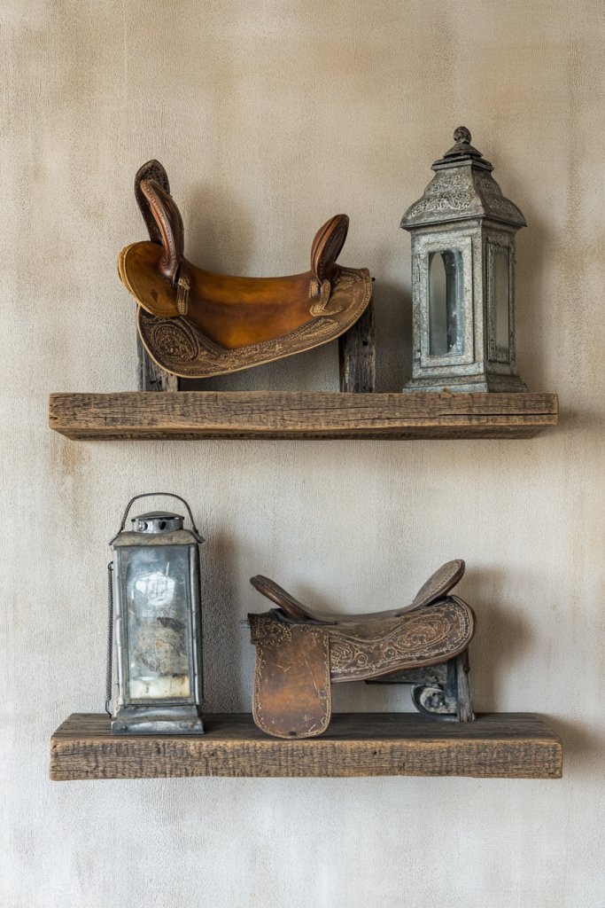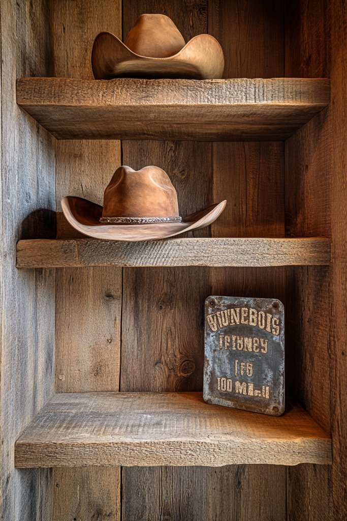 Decorate with Western collectibles, vintage trinkets, or handcrafted ceramics. Add personalized signs or engraved plaques to give it a unique touch. Use baskets or crates for extra storage on the shelves. Incorporate seasonal decorations like dried herbs or rustic candles. Personal touches turn functional shelves into a statement feature.