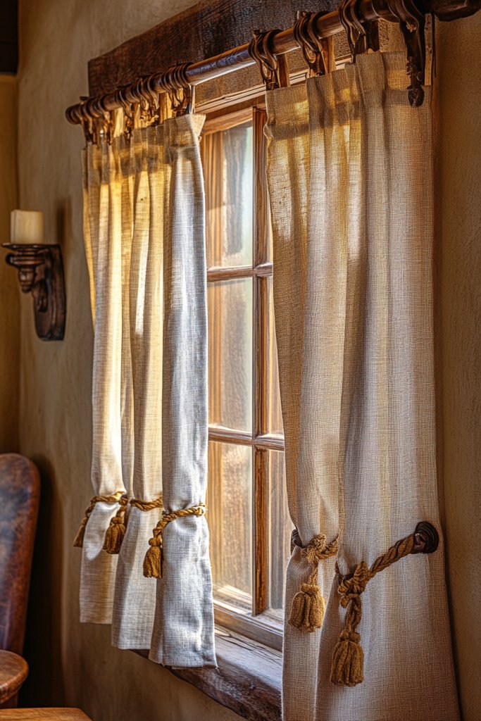 Picture simple linen or burlap curtains with leather tiebacks, hanging in front of large windows. The natural fibers and rough textures evoke a frontier cabin or ranch house. Iron or wood curtain rods with decorative finials add finishing touches. The soft, flowing fabric contrasts beautifully with textured walls and furniture, completing the rustic look.