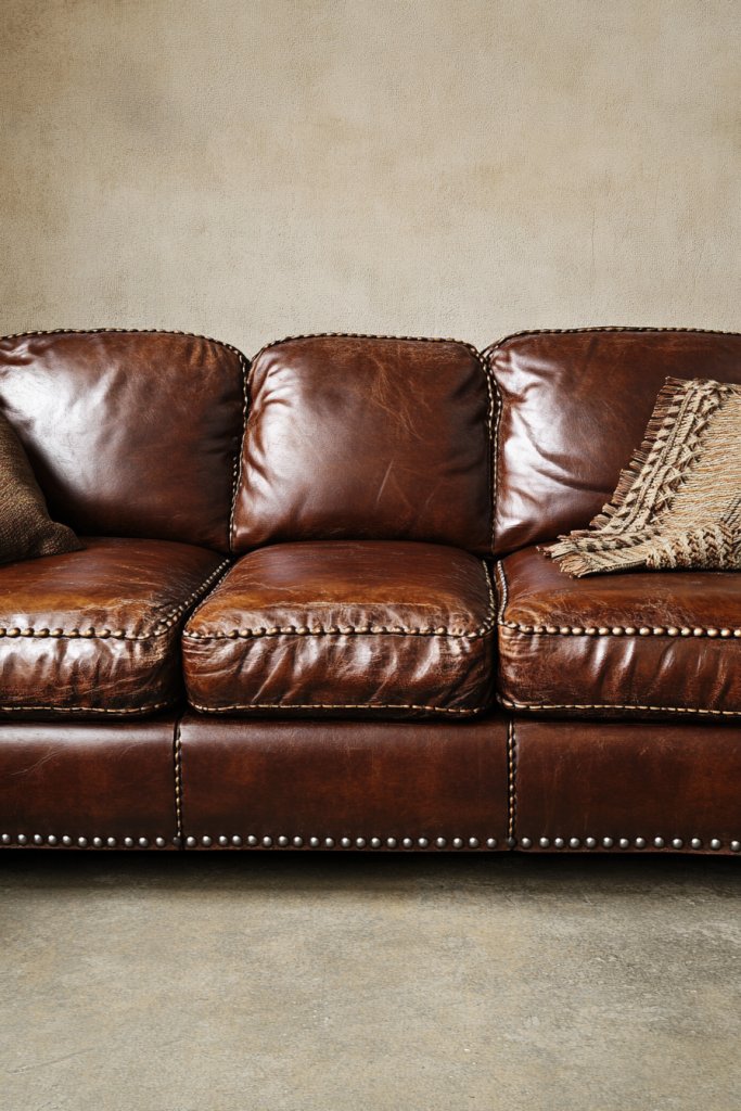 Picture a plush leather sofa with nailhead trim outlining its arms and base, reminiscent of an Old West saloon. The rich caramel or deep brown tones add warmth and sophistication. Pair it with leather armchairs featuring tufted backs and rustic wooden legs. Soft, textured throws draped over the furniture add a cozy layer, inviting you to settle in for hours.