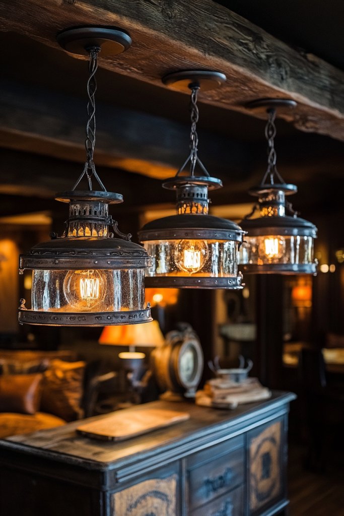 Imagine wrought iron pendant lights hanging over your seating area, their dark metal finish contrasting with warm, textured walls. Lantern-inspired sconces flank the walls, casting a soft glow reminiscent of old Western towns. The flickering light highlights rustic wooden beams and textured surfaces, creating a nostalgic, inviting atmosphere. The fixtures themselves look like relics from a bygone era, adding authenticity.