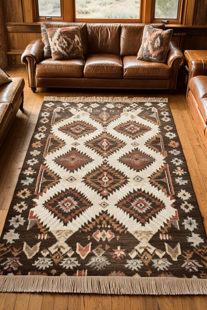 Visualize a woven rug with vibrant Navajo or Southwestern patterns spread under your seating area. The earthy tones—terracotta, navy, cream—complement leather and wood perfectly. The textured surface adds dimension and comfort underfoot. It anchors the room, making everything feel more cohesive and inviting.