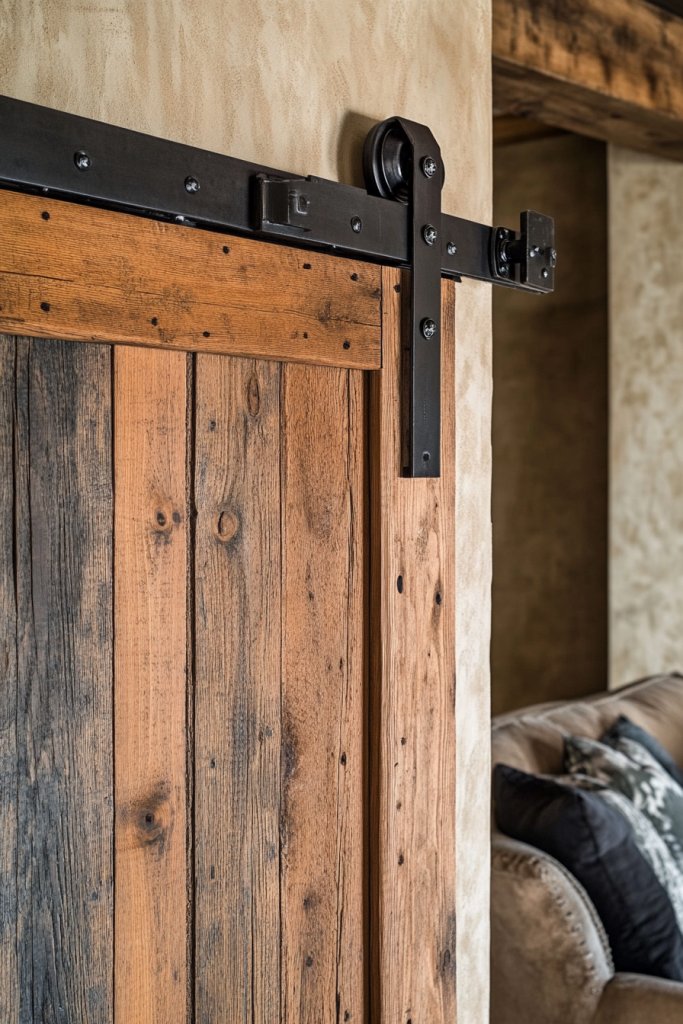 Picture a large, distressed wooden door with black metal hardware sliding open to reveal the living room or a closet. The rough-hewn wood and iron accents create a striking focal point. The hardware’s industrial look contrasts beautifully with softer textures in the room, adding depth and character. When open, the door adds an element of surprise and rustic elegance.