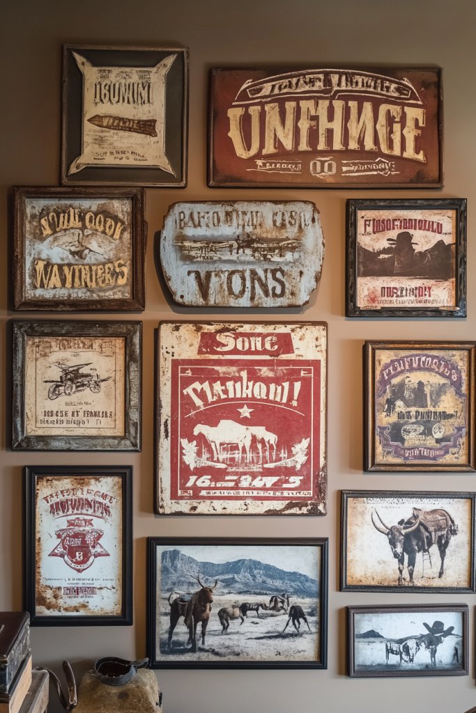 Create a focal gallery wall with a mix of signs, posters, and small memorabilia. Incorporate personal items like vintage license plates from road trips or custom signs with family names. Use distressed wood backing or frames to enhance the rustic feel. Seasonally, add themed elements like cowboy hats or leather straps for variety.