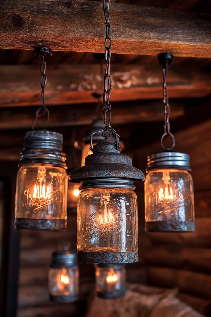 Envision clear mason jars filled with string lights or small LED candles, placed on shelves or tables. Metal lanterns with distressed finishes hang from hooks or sit on side tables, casting flickering light across textured walls. The soft glow highlights rustic decor elements and creates an intimate, welcoming atmosphere. These fixtures look like relics from a frontier settlement, adding authenticity.