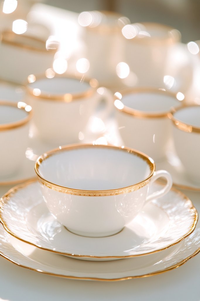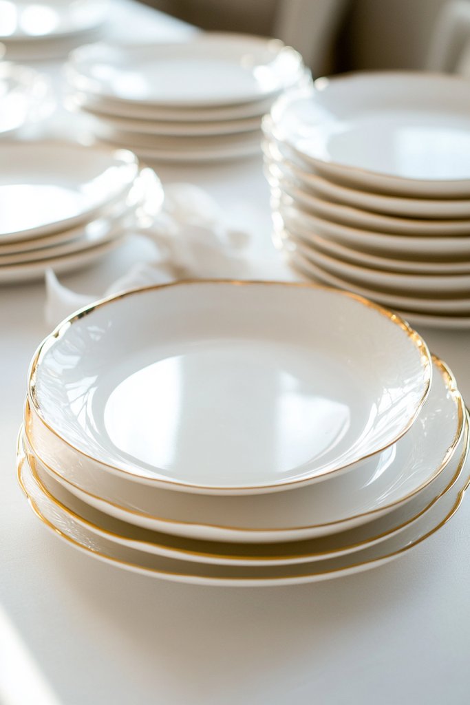 Imagine pristine white plates with delicate gold rims, stacked neatly or arranged on a beautifully set table. Gold-trimmed bowls and serving dishes complement the plates, creating a cohesive, luxurious look. The subtle metallic accents catch the light, making every dish feel special. Paired with neutral or textured linens, the table exudes understated elegance.