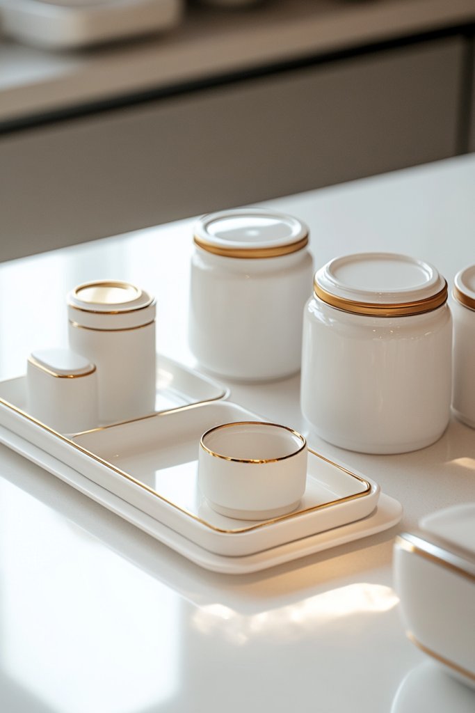 Visualize a set of white ceramic jars with gold lids and accents, neatly arranged on your countertop. Gold-trimmed trays hold your utensils or spices, adding shimmer and sophistication. The combination of matte white and shiny gold creates a refined, balanced aesthetic. Small details like handles or rims in gold elevate the entire look.