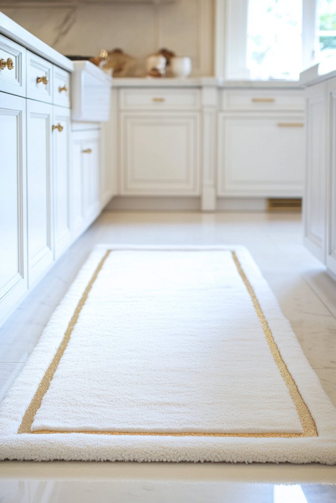 Picture a plush white rug with subtle gold geometric borders or patterns, placed in front of the sink or island. The metallic accents catch the light, adding a touch of glamour to everyday routines. Textured fabrics invite you to step barefoot, making the space cozy and inviting. The contrast of soft material and shiny gold details creates a balanced, upscale look.