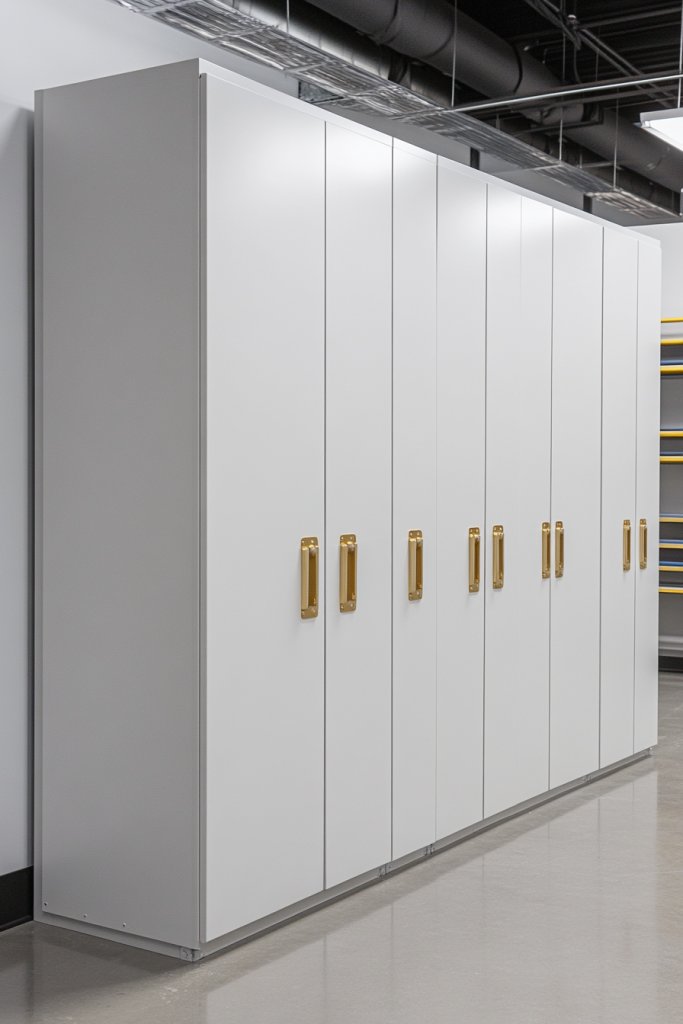 Envision pristine white doors with sleek gold knobs or handles, creating a smooth, uniform facade. The gold hardware catches the light, adding warmth and elegance. When closed, they provide a clean, minimalist backdrop; when open, reveal organized shelves filled with beautifully stored essentials. The contrast between white and gold adds subtle sophistication.