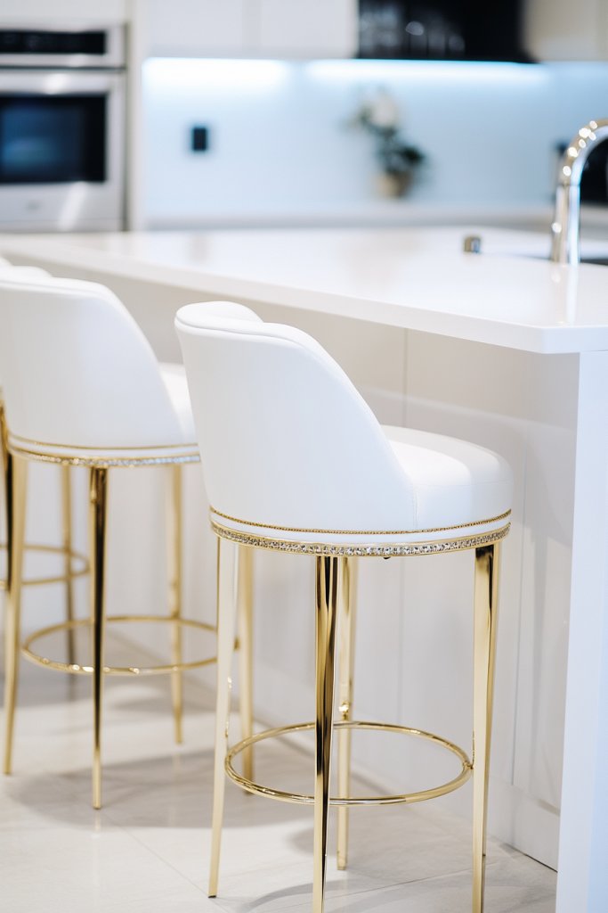 Picture sleek white upholstered stools with slim gold legs and accents, arranged around your kitchen island. The gold trim catches the light, adding a luxe touch that elevates the entire space. The neutral white upholstery invites you to sit comfortably, while the metallic details add sparkle. The overall vibe is modern luxury with a hint of glam.
