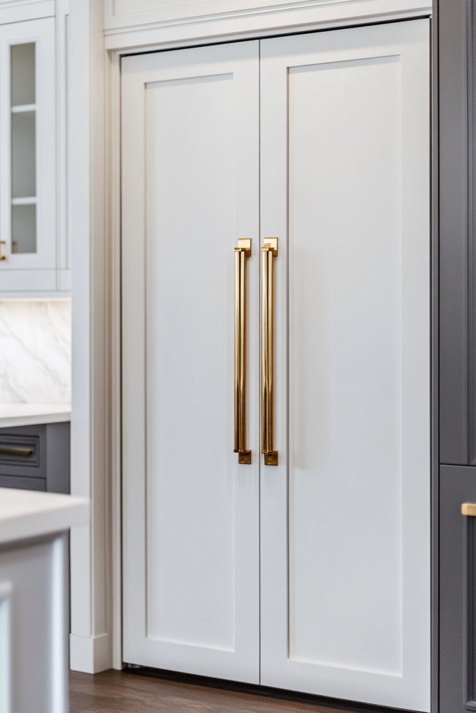 White pantry doors with gold hardware create a cohesive, elegant storage solution. They blend seamlessly with various decor styles, from modern to vintage. When your storage looks this polished, your kitchen feels more inviting and organized. It’s a small upgrade with a big impact.