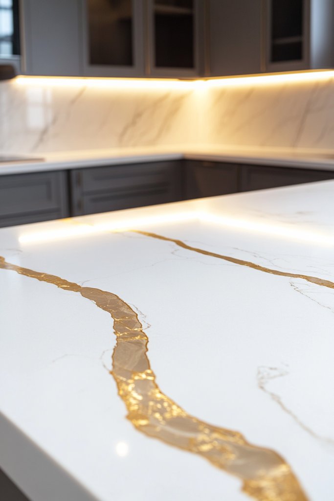 Add warmth with gold-trimmed accessories like soap dishes or utensil holders. Incorporate textured textiles or patterned backsplashes that echo the veining. Use lighting to highlight the natural beauty of the stone, like under-cabinet LEDs or pendant lights with gold accents. Keep the overall look balanced and uncluttered.