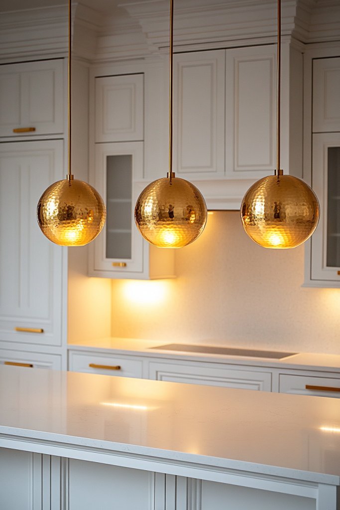 Ever felt your kitchen lacks that wow factor during gatherings? Gold pendant lighting over a white island brings instant drama and warmth. It sets the perfect mood for entertaining or cozy family dinners. Plus, it’s a statement piece that pulls the whole look together effortlessly.