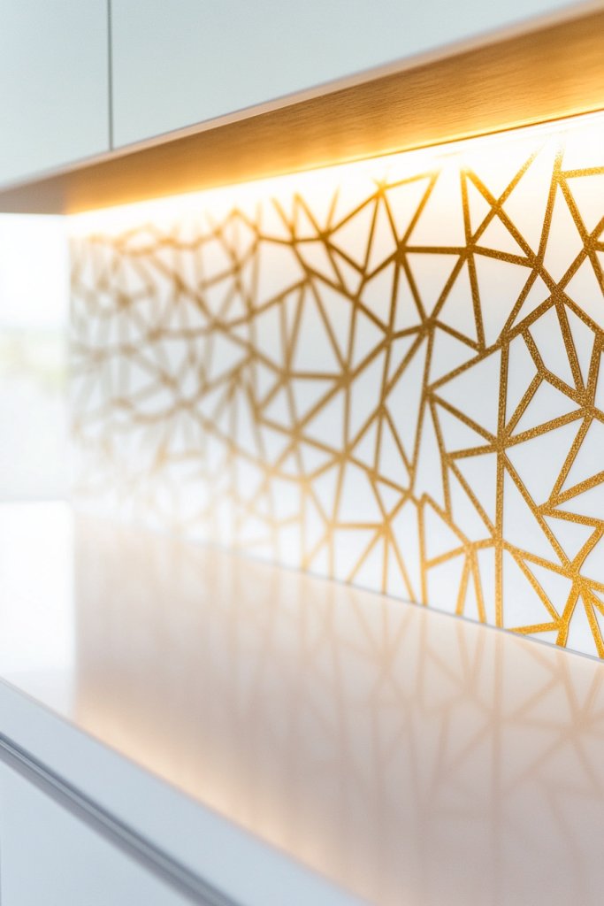5. White and Gold Backsplash with Geometric Patterns