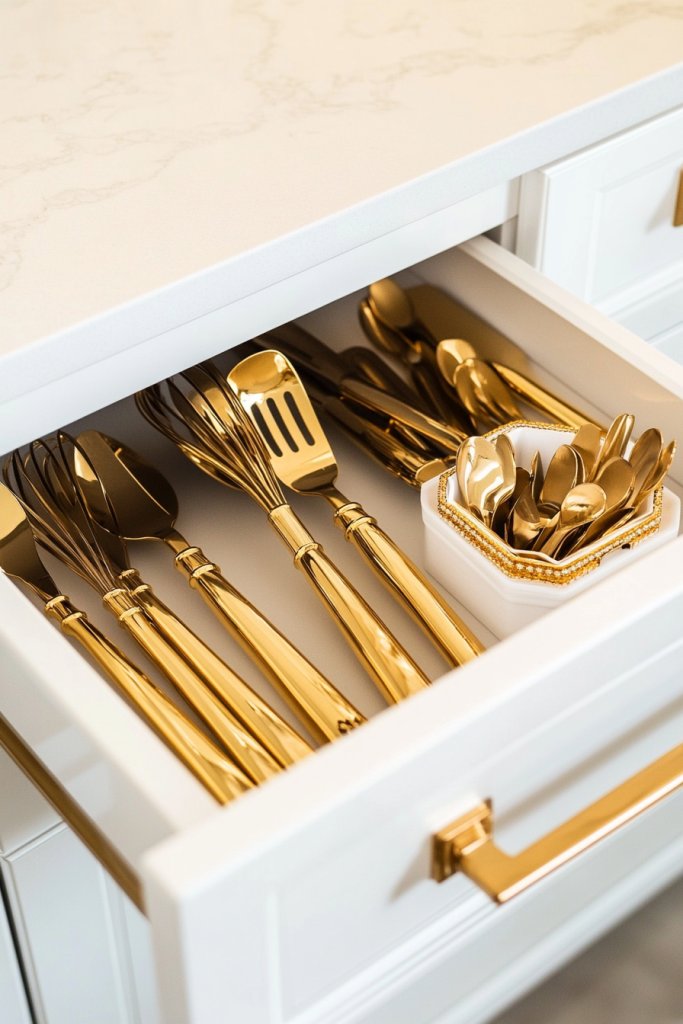 Imagine a sleek white countertop with a matching gold-handled utensil holder filled with spatulas, whisks, and spoons. The gold handles catch the light, adding a touch of luxury to your workspace. Coordinated sets in white containers with gold accents keep everything organized and easily accessible. The visual harmony makes your kitchen look intentionally curated.